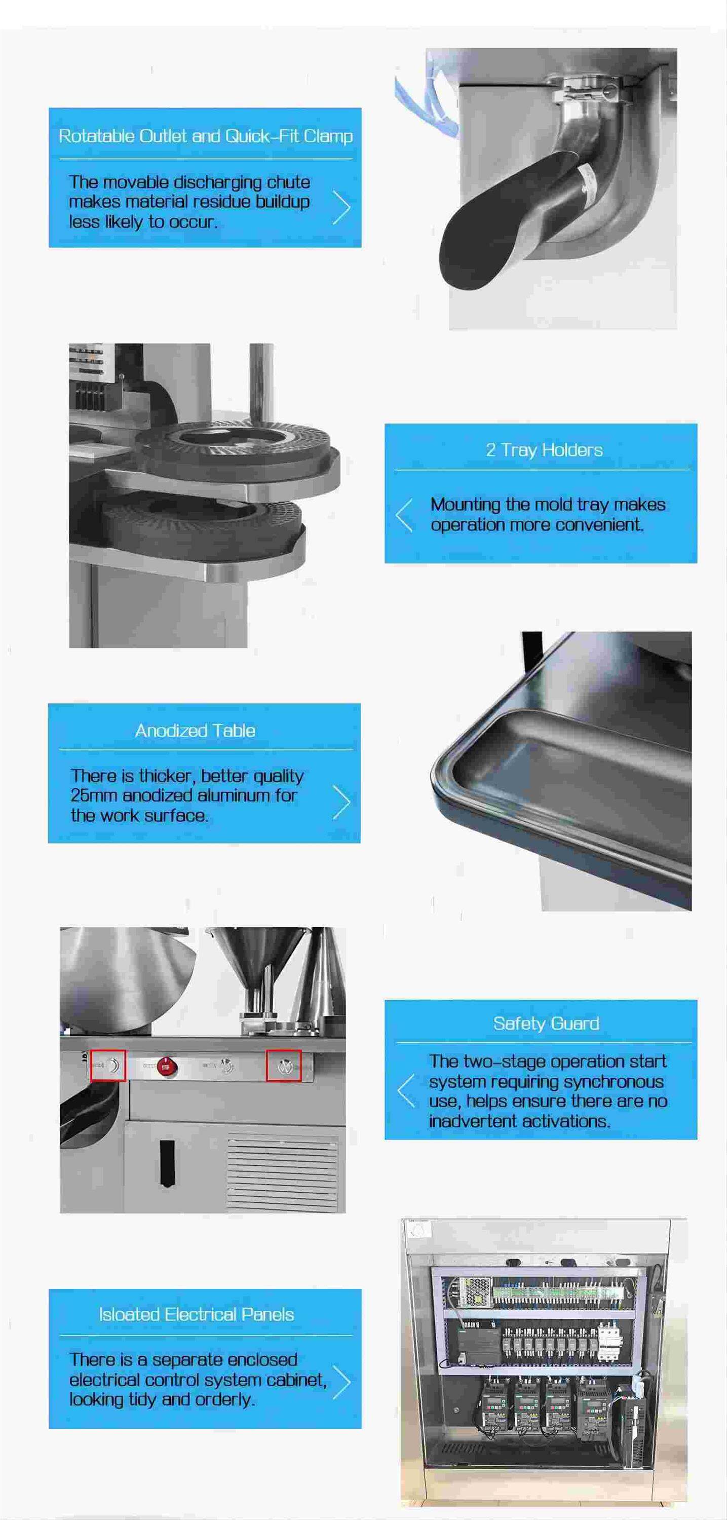 The capsule filler can handle all capsule sizes from 000 to 5. A special design allows for changing mold for different size capsules within 15 minutes easily, simply, and precisely.