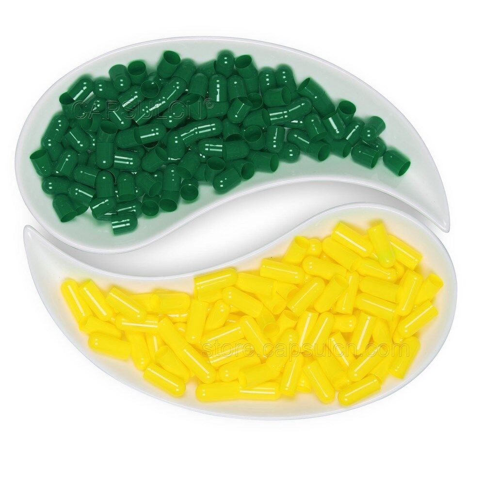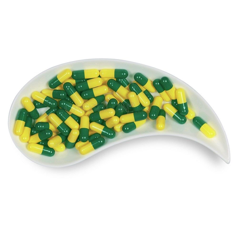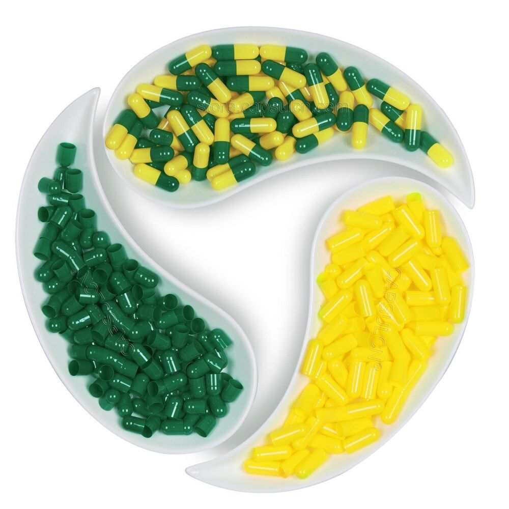 Size 00 dark green yellow empty gelatin capsules 100% hide gelatin,derived from bovine raw materials Outstanding quality, in accordance with GMP standards Suitable for pharmaceuticals health and nutrition products Keep away from direct sunlight, hot water and high temperatures Do not fill capsules with any liquid suspension because they will dissolve prior to consumption