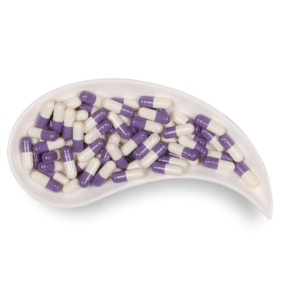Size 2 purple white empty gelatin capsules 100% BSE Free (Derived from bovine raw materials) 100% Hide gelatin derived from the skin 100% Preservative Free Non GMO, Allergen Free, & Gluten Free Outstanding quality, in accordance with GMP standards